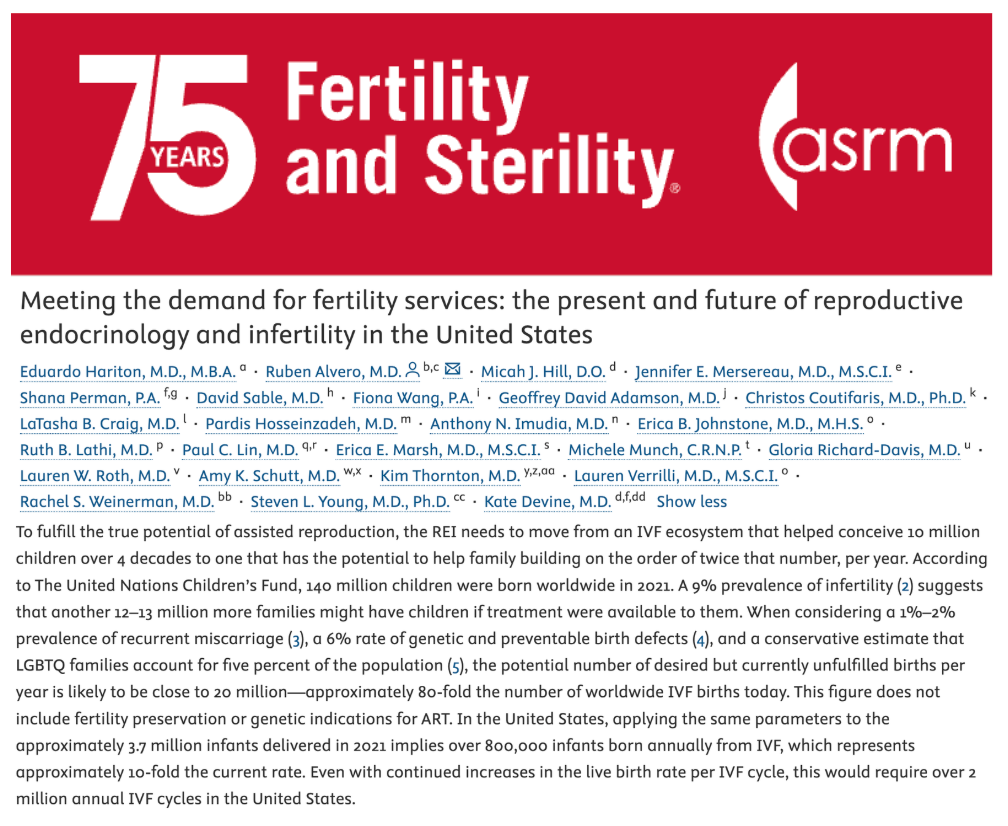 "To fulfill the true potential of assisted reproduction, the ART ecosystem needs to move from an IVF that helped conceive 10 million children over 4 decades to one that has the potential to help family building on the order of twice that number, per year."