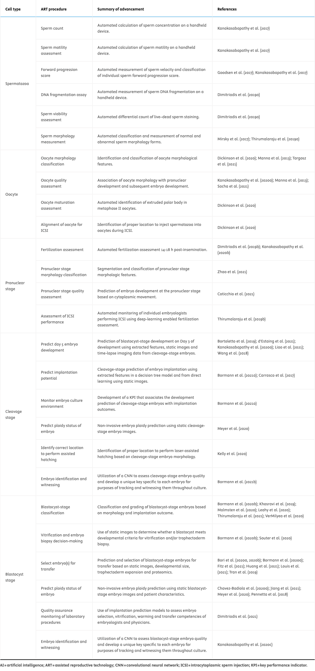 Initially, prediction models were based on well-known statistical models (Bancsi et al., 2004; Hunault et al., 2002; Jurisica et al., 1998; van Weert et al., 2008). More recently, the emerging technologies of time-lapse incubators and preimplantation genetic testing (PGT) were introduced as important achievements in the field, with the potential to produce a more objective method of selecting embryos with the best implantation probability. However, at present, there is insufficient evidence to recommend the routine use of these techniques for the sole purpose of improving single embryo transfer live birth rates (Khosravi et al., 2019; Tiitinen, 2019). Within the last decade, machine learning, more specifically convolutional neural networks (CNN), have been used to assist with medical imaging in a variety of fields, such as ophthalmology (Abràmoff et al., 2016), dermatology (Esteva et al., 2017), radiology (Hosny et al., 2018) and pathology (Khosravi et al., 2018) (Table 1). This technology has also been applied in the embryology laboratory, aiming to improve the selection of a single embryo with the best implantation potential to achieve the ultimate goal of fertility treatment: the birth of a healthy baby (Khorsavi et al., 2019). Since artificial intelligence (AI) has found a place in IVF, its potential use in nearly every aspect of infertility patient care has been investigated, including for identifying empty or oocyte-containing follicles; predicting embryo cell stages, blastocyst formation from oocytes, and live birth from blastocysts; assessing sperm morphology and human blastocyst quality; improving embryo selection; developing optimal IVF stimulation protocols; and quality control (Bormann et al., 2021a; Curchoe and Bormann, 2019). The goal of this review is to summarize recent advancements using AI technology in the embryology laboratory (Table 2).