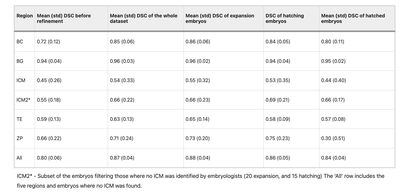 The ICM was the most challenging region to segment, both for the embryologists, when presented with static images, and for our method. This was perhaps because of its large optical similarity with the TE, or due to those embryos where it could be erroneously confused with TE either because it was out of focus, completely invisible in the image, or the embryo was collapsed. However, the proposed method always tries to find it on the micrographs, and produces a zero DSC when it is absent, which could explain the low mean and high standard deviation. By removing the 107 images with no ICM identified by the embryologists, the score increased from 0.54 to 0.66.