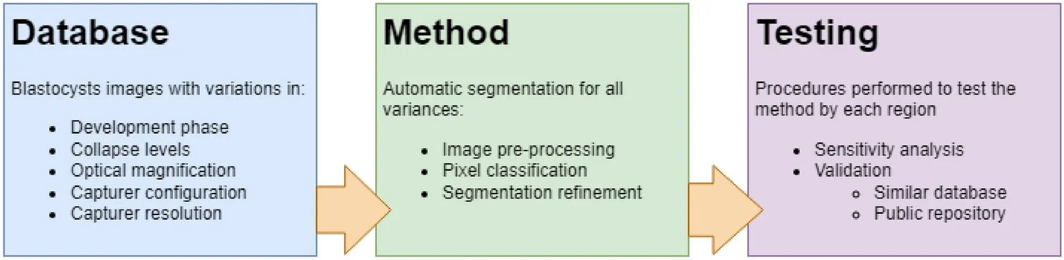 Image pre-processing and model trainingThe method consisted of three steps: (i) pre-processing of the micrographs to segment and standardize the images, (ii) classification of the pixels in the pre-processed image to the relevant blastocyst zone, and (iii) a post-processing refinement to improve the segmentation based on the structure of the blastocyst regions.