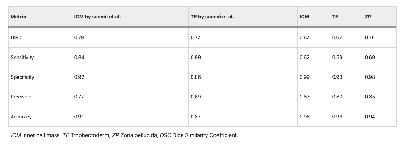 In the second dataset, our method showed higher specificity, and precision, but lower DSC and sensitivity than the results reported by Saeedi et al., in both regions (TE and ICM). These results suggest a high performance among the pixels predicted as TE and ICM (a high true positive rate), but also leaving many pixels among the mask unselected (high false negative rate). This behaviour is demonstrated by nearly absolute specificity (0.99 and 0.98 for ICM and TE respectively), interpreted as correctly identifying almost all the true negative pixels, in contrast with a very low sensitivity (0.62 and 0.59 for ICM and TE respectively). Put simply, when our method classifies a pixel as TE or ICM, it is highly possible that it is true, but there might be many other pixels that our method is missing. However, in the overall accuracy (metric including both true and false positives) our method demonstrated a better performance (0.96 and 0.93 for ICM and TE respectively). When comparing the performance of our method in both datasets, we found a slightly better result in the dataset provided by Saeedi et al., by an increase in DSC of 0.13, 0.04, 0.01, and 0.04 for ICM, ICM2, TE, and ZP. This could be due to the heterogeneity (laboratory settings, blastocysts phases, embryo quality) of our dataset, and the inclusion of collapsed embryos and non-evident ICM, such as embryos photographed while the ICM was not in the focal plane.