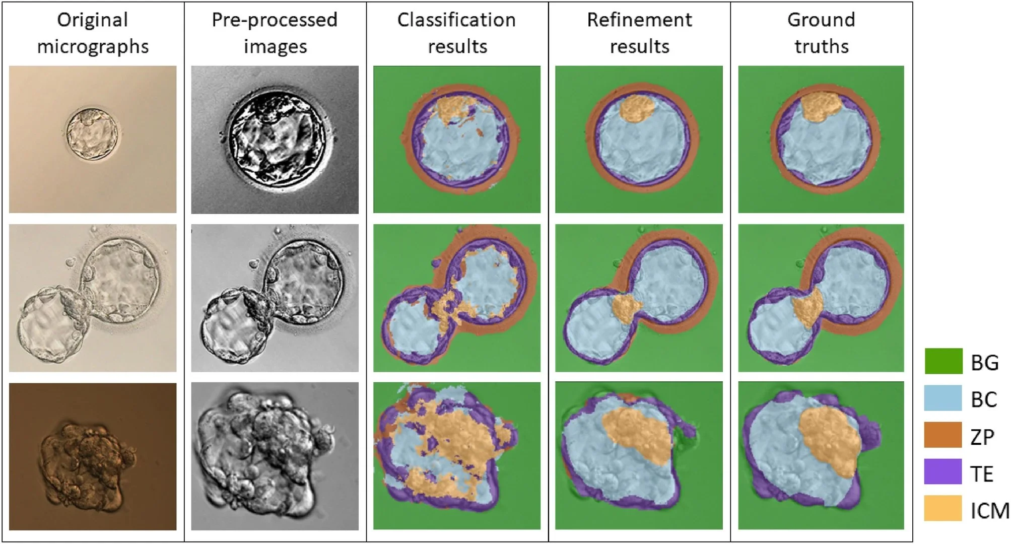 Figure 2 Examples of the original blastocyst micrographs, the images after pre-processing, before and after the segmentation refinement, and the ground truth. Please note that these images might have been stretched, shrunk, or cropped for aesthetic purposes, but the pixel values remained unaltered.
