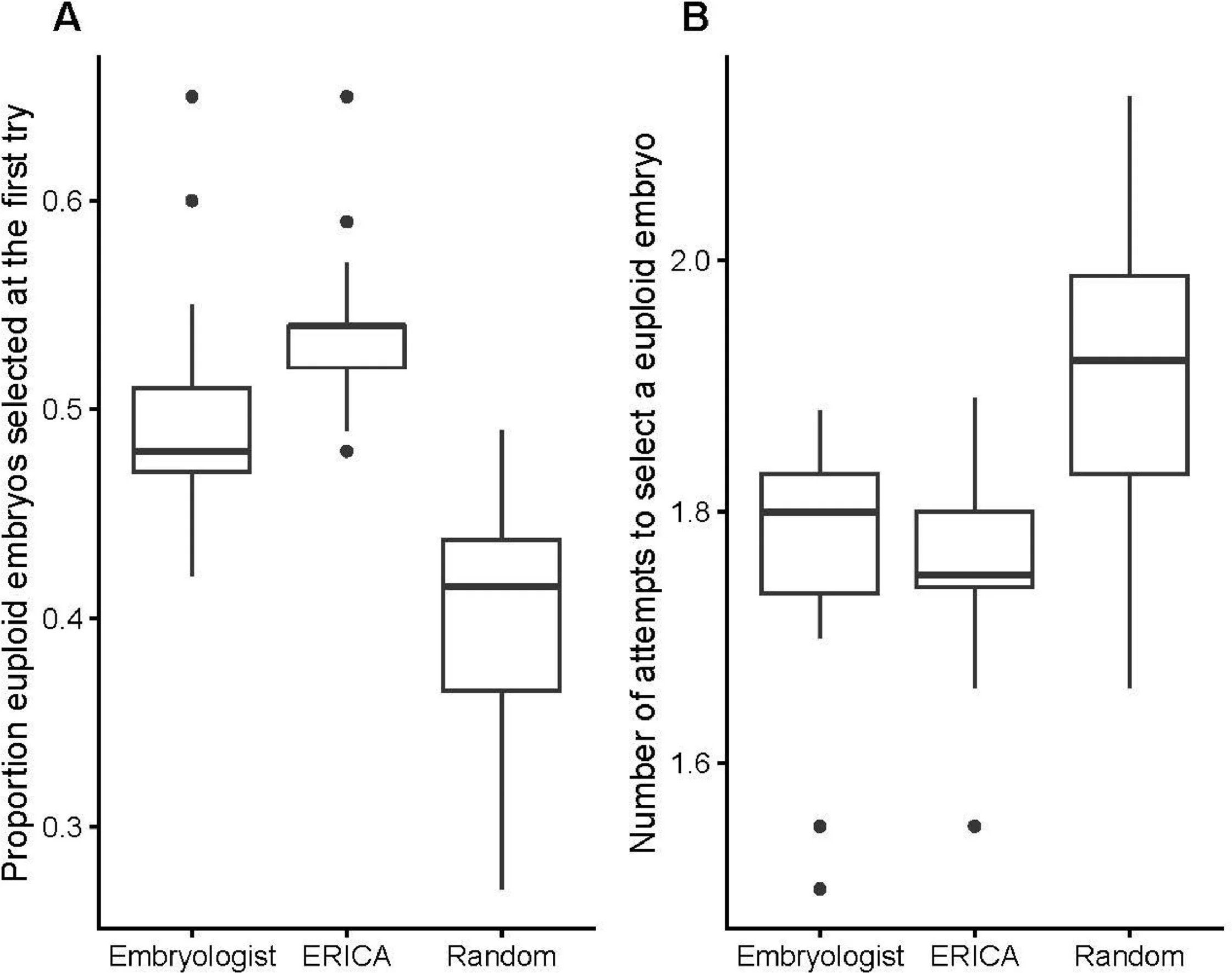 Figure 3 Embryologists and ERICA perform better than random. Box and whisker plots showing (A) the proportion of euploid embryos selected at the first try for embryologists based on morphology alone, ERICA and the randomizer, with post-hoc testing by Bonferroni corrected Dunn test indicating that ERICA outperforms both the embryologists and the randomizer (P = 0.002 and P = 1.629793e-15, respectively), and that the embryologists outperform the randomizer (P = 9.400497e-04); (B) the number of attempts to select a euploid embryo for embryologists, ERICA and the randomizer, with post-hoc testing by Bonferroni corrected Dunn test indicating that both the embryologists and ERICA outperform the randomizer (P = 2.952989e-04 and P = 4.413281e-09, respectively), whereas no difference was found between the embryologists and ERICA (P = 0.44). Box and whisker plots show median (interquartile range), maximum and minimum and outliers. ERICA and the randomizer performed 150 cycles each. The six junior embryologists all carried out 150 simulated cycles; the six intermediate embryologists carried out 47, 58, 140, 150, 150 and 150 simulated cycles, respectively; the seven experienced embryologists carried out 20, 20, 149, 150, 150, 150 and 150 simulated cycles, respectively.