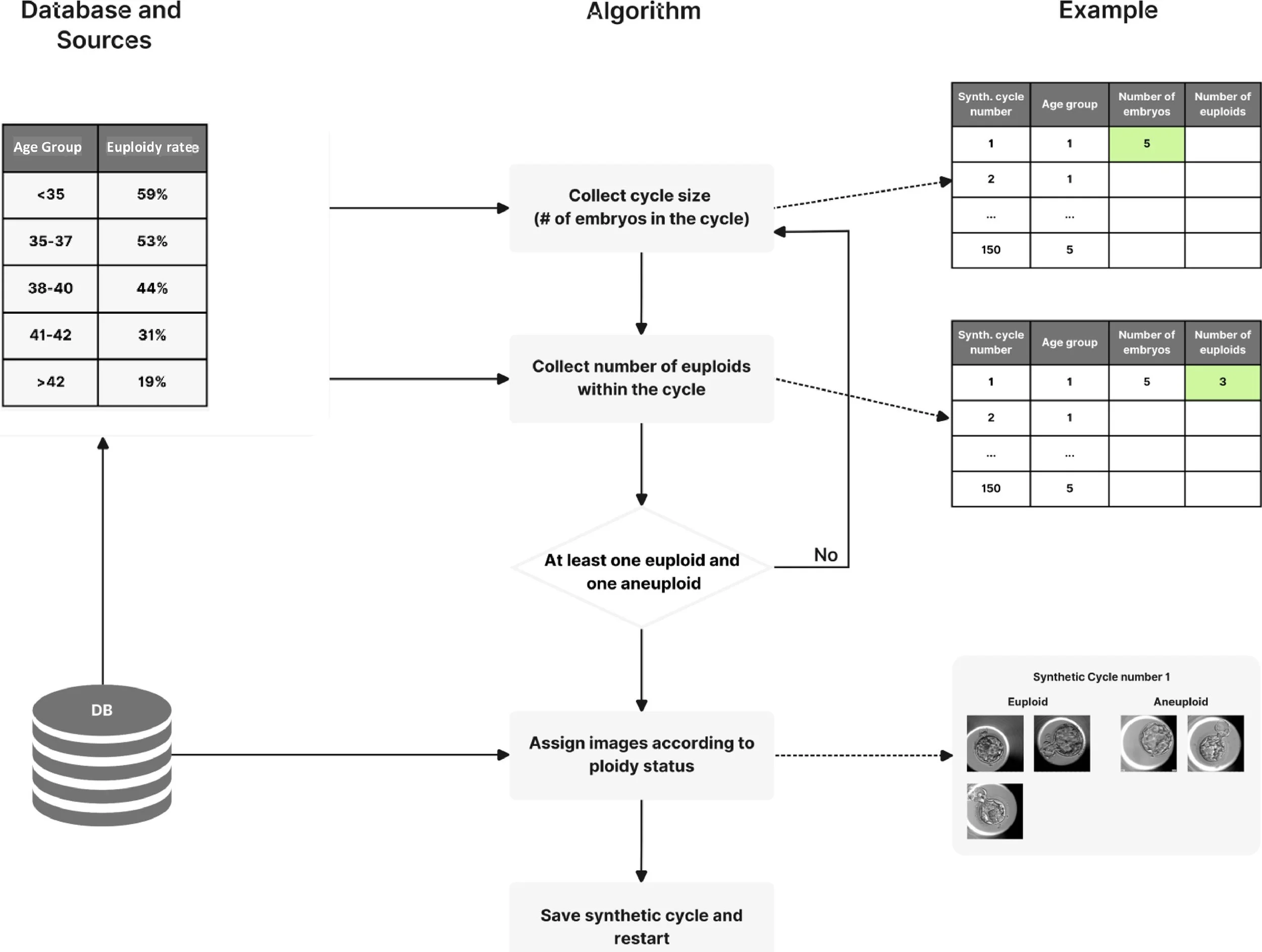 To create the ‘cases’ presented in the selection tool, a database was created of blastocyst images (all day 5), their known ploidy status (from PGT-A) and metadata (patient’s age, embryo age at the time of the picture and ERICA score). Exclusion criteria included poor image quality (using ERICA’s standards), mosaic and unknown ploidy diagnoses. A probabilistic distribution of blastocysts was then created with known ploidy in a cycle by age groups at the time of egg retrieval, according to the following maternal age groups: younger than 35 years (euploidy rate of 59%), 35–37 years (53%), 38–40 years (44%), 41–42 (31%), over 42 years (19%), then ran the following process (Figure 1) to create the synthetic embryo scaffolds: collection of one cycle size from the corresponding distribution that is between 2 and 6; collation of the number of euploids within the cycle corresponding to variations in chromosome abnormalities in human blastocysts according to age (Sawarkar et al., 2021); if the cycle contained at least one euploid and one aneuploid, the process was continued or else the first step restarted; according to their ploidy status, we assigned randomly without replacement with real embryo cases (images and metadata) from our database of embryos with known ploidy. This process was iteratively repeated until 30 synthetic cycle scaffolds had been created from each age group, for a total of 150 cases.