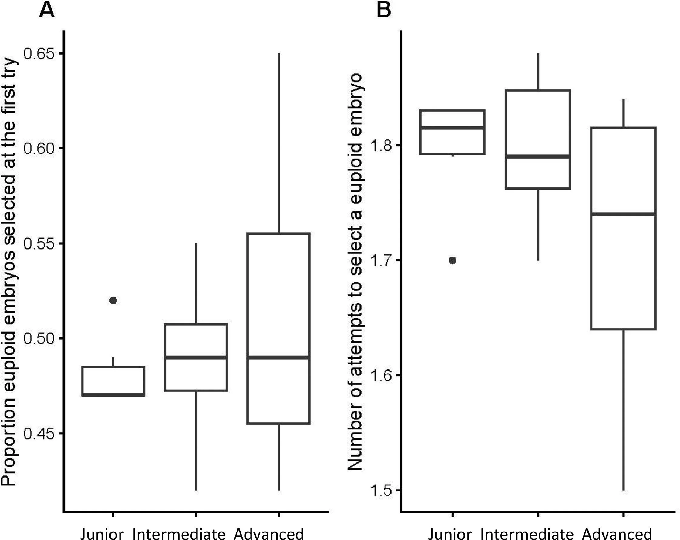 Figure 4 Box and whisker plots showing (A) proportion of euploid embryos selected at the first try and (B) the number of attempts to select a euploid embryo (Kruskal–Wallis chi-squared = 0.16748, df = 2, P = 0.92 and Kruskal–Wallis chi-squared = 1.4176, df = 2, P = 0.49, respectively), based on morphology alone. Box and whisker plots show median (interquartile range), maximum and minimum and outliers. The six junior embryologists all carried out 150 simulated cycles; the six intermediate embryologists carried out 47, 58, 140, 150, 150 and 150 simulated cycles respectively; the seven experienced embryologists carried out 20, 20, 149, 150, 150, 150 and 150 simulated cycles, respectively. Although senior embryologists showed a trend towards better performance than those less experienced (junior and intermediate), these differences were not statistically significant.